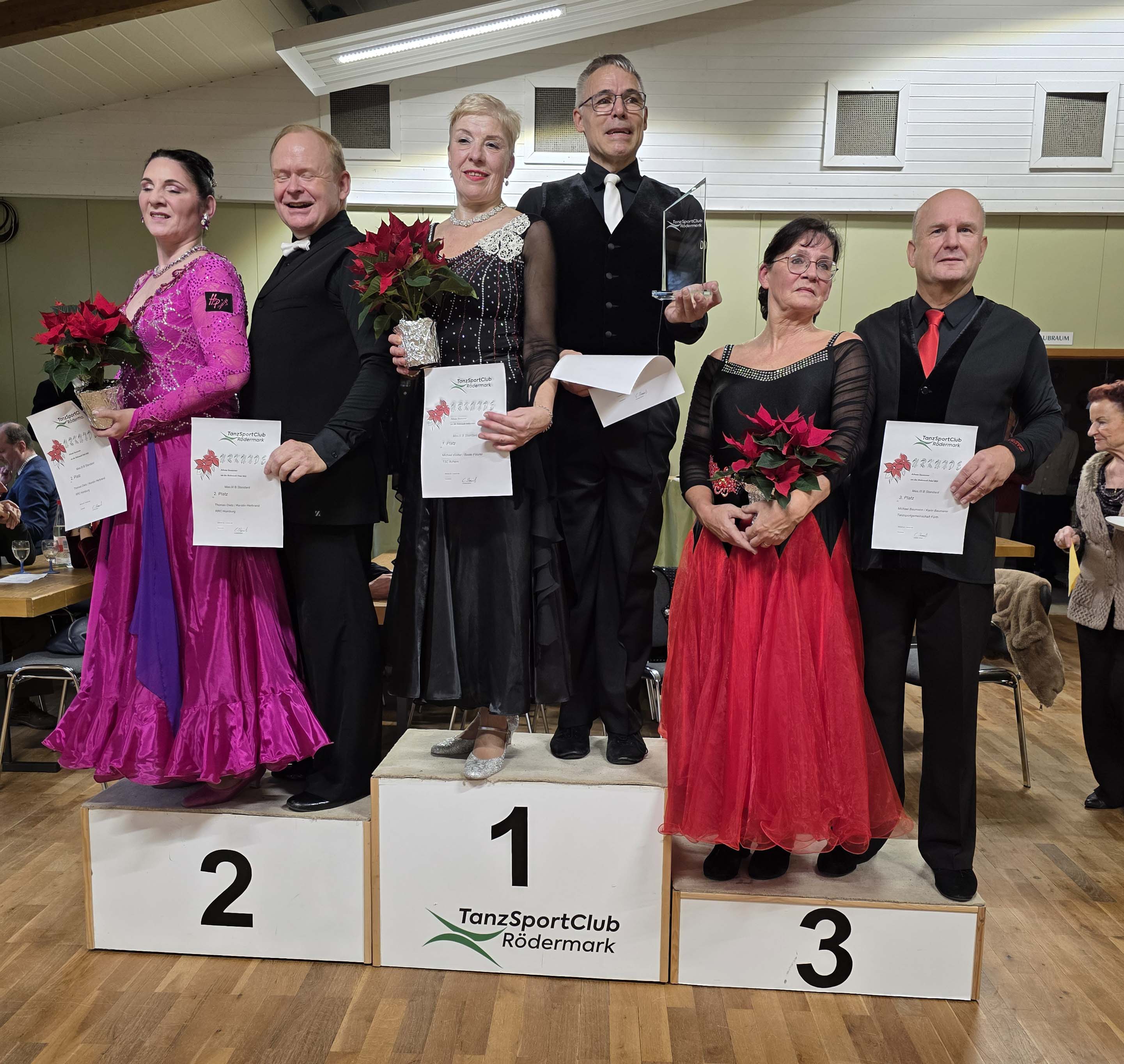 Am 7. Dezember veranstaltete der TanzSpotClub Rödermark seine traditionellen Adventsturniere um den Rödermarkpokal. In allen sechs angebotenen Turnieren hatten sich genügend Paare gemeldet und reisten auch an, so dass insgesamt sechs Pokale zu gewinnen waren. Zunächst tanzten zwei Paare in der Masters II D-Latein um den begehrten Pokal. Stephan und Nicole Erhardt nahmen den Glaspokal mit nach Viernheim. Im anschließenden Turnier der Masters II C-Latein gingen Marc und Nadine Behrens, nach ihrem kürzlich gefeierten Aufstieg vor heimischer Kulissen, an den Start. Am Ende war es der dritte Platz für das TSC-Paar mit klarer Tendenz zu Platz zwei. Dann feuerten die Fans Wolfgang und Anja Marx in der Masters III B-Latein an. Sie fühlten sich von der heimischen Kulisse sichtlich inspiriert und ließen der Konkurrenz keine Chance. Am Ende streckten sie auf Platz eins den Rödermarkpokal 2025 in die Höhe. Als Siegerpaar durften sie die anschließende A-Klasse mittanzen. Unbeschwert tanzten sich auf Platz zwei mit sogar einem Sieg in der Rumba. Dann kamen die Fans der Standardtänze auf ihre Kosten. Zunächst bewarben sich drei Paare der Masters III B-Klasse um den Pokal. Den Gewinn des Pokals feierten Michael Klotter und Beate Feurer vom TSC Achern. Als krönenden Abschluss gab es für die zahlreichen Zuschauer ein Turnier der Masters IV S-Klasse. Mit elf Paaren war das Turnier nicht nur quantitativ gut besetzt, sondern auch die Qualität der Paare war ein wahrer Augenschmaus. Die Deutschen Vizemeister dieser Klasse, Hans und Petra Sieling (TSC Fulda) ließen sich am Ende als klare Sieger und Gewinner des Rödermarkpokal 2025 feiern. Alle Ergebnisse findet man hier