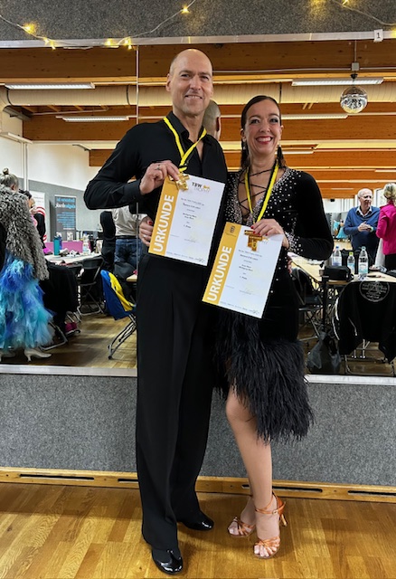 Anja und Wolfgang Marx, das erfolgreichste Lateinpaar im TSC Rödermark, hatte da schon höhere Ansprüche. Denn schließlich hatten sie erst Anfang des Monats den Rödermarkpokal zu Hause gewonnen. In einem anderen Bundesland erfolgreich zu sein, ist eine große Herausforderung. Doch die beiden Tänzer bewiesen, dass sie die Konkurrenz nicht fürchten müssen. Am Samstag musste sie in der Masters III B-Latein nur dem Heimpaar den Vortritt auf dem Siegerpodest lassen. Dies weckte ihren Ehrgeiz. Sie nahmen die Revenge an und holten sich am Sonntag den Sieg. Mit 78 von möglichen 80 Punkten ließen sie sich als Gesamtsieger der diesjährigen TBW-Trophy feiern.